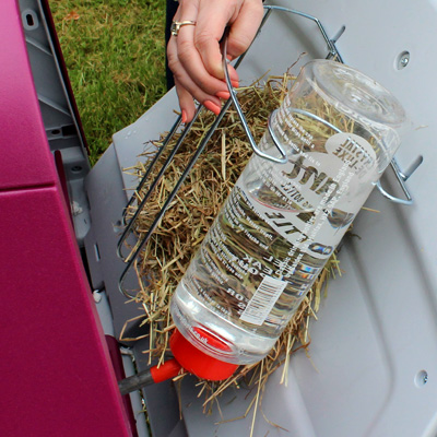 A bespoke hay rack which attaches to the Eglu and a 600ml water bottle which slots in.